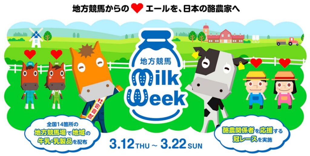 地方競馬からのエールを、日本の酪農家へ応募期間「2026/3/12~2026/3/22」今年もミルクウィークを開催!乳製品をプレゼントしてくれますので、日本の酪農のことを知って応募すれば美味しそうな賞品が手に入るチャンスですよ。全国14箇所...