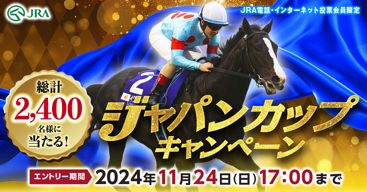 ジャパンカップキャンペーンエントリー受付中!電話・インターネット投票で、11/24(日)に開催するジャパンカップの馬券を500円以上ご購入いただくと豪華賞品が当たる! エントリーは11/24(日)17時まで!