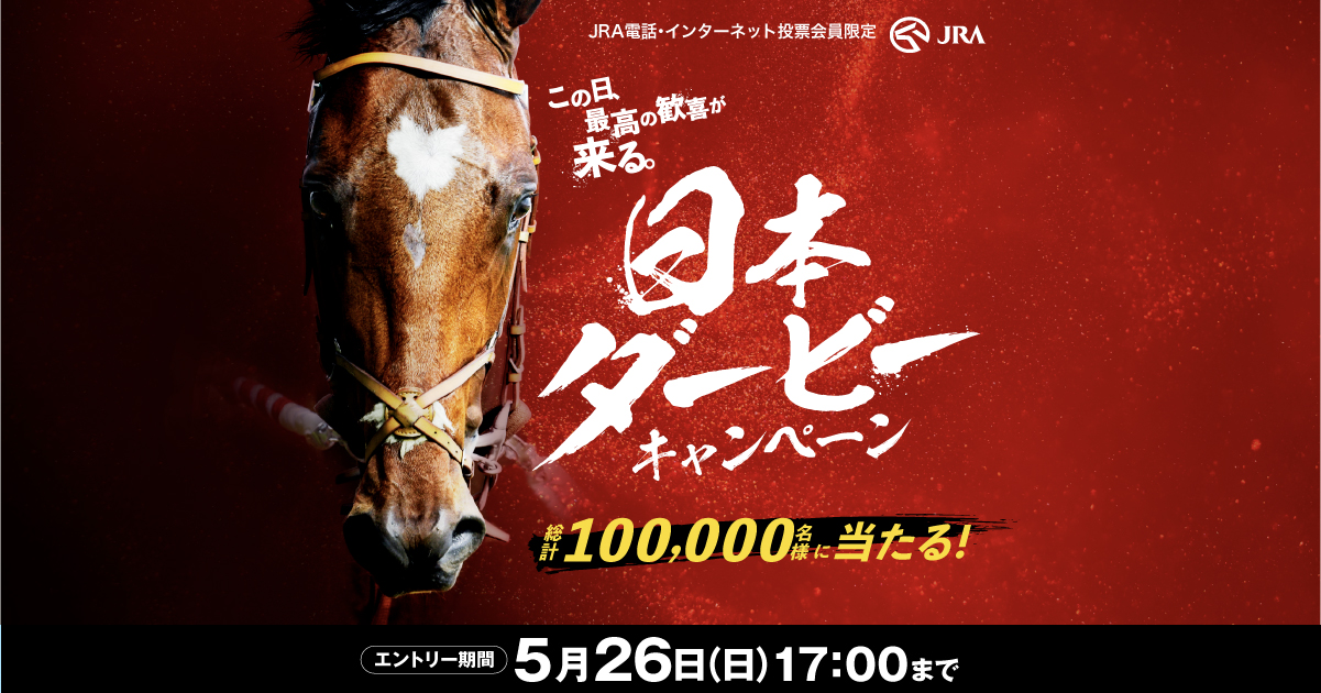 この日、最高の歓喜が来る。総計100,000名様に豪華賞品が当たる!日本ダービー優勝馬21頭がデザインされたQUOカードセットなどの賞品が抽選または先着で当たる!エントリーは5/26(日)17時まで。