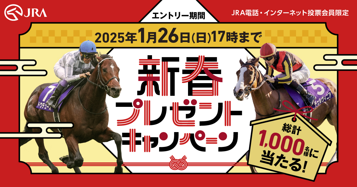 新春プレゼントキャンペーンエントリー受付中!JRA電話・インターネット投票でご購入いただくと、購入金額に応じて抽選で豪華賞品が当たる!エントリーは1/26(日)まで!